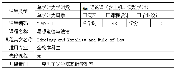 本课程是一门融思想性、政治性、科学性、理论性、实践性于一体的思想政治理论课,是面向全校本科生开设的公共必修课。本课程以习近平新时代中国特色社会主义思想为指导思想,坚持正确的世界观、人生观、价值观、道德观和法治观,把社会主义核心价值观贯穿教学的全过程,通过理论学习和实践活动,帮助学生形成崇高的理想信念,弘扬伟大的中国精神,确立正确的人生观和价值观,加强思想品德修养,增强学法、用法的自觉性,全面提高大学生的思想道德素质和法治素养。