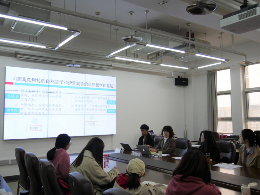 读书会以“真学、真懂、真信、真用、真教”为宗旨,以阅读马克思主义经典原著为方向,采取句读研讨、师生互动、专家讲解等丰富形式,坚持打造tyc522cc太阳成集团学术共同体。以教师推荐读本、学生自荐领读、师生共同研读的形式,本学期经典读书会共策划开展八期经典阅读活动,书目涉及哲学、文学、历史学、社会学等多个领域。本期读书会围绕马克思的博士论文《德谟克利特的自然哲学和伊壁鸠鲁的自然哲学的差别》进行阅读讨论,共分为“学生领读、教师解读、交流提问”三个环节。