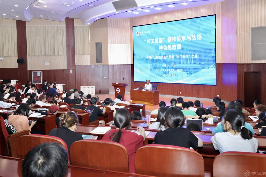 王力深入讲解了智能制造的核心内涵与构成要素,系统梳理了从传统制造到智能制造的转型升级之路。他结合中国在工业互联网、智能装备与机器人等前沿尖端领域的突破性成果,强调了推动智能制造发展的重要意义。他从学校办学近80年的发展历程出发,聚焦学校在智能制造领域的持续探索,通过一个个鲜活的案例,生动诠释了北方工大人在挑战科技前沿中的奋勇拼搏和锐意进取,始终以“工业报国、工业兴国、工业强国”的精神底色和实际行动服务国家重大战略需求。王力表示,新时代以来,学校进入高速发展时期,依托老工科、拓展新内涵,在新赛道跑出加速度,开启了新学科、新学院、新专业、新校区的“四新”建设新阶段。他号召同学们要把握时代机遇,传承“兴工报国”红色基因,以服务国家战略、推动区域高质量发展为核心,在智能制造发展浪潮中勇担使命,聚焦科技前沿,不断开拓创新,展现出新时代北方工大人的挺膺担当。